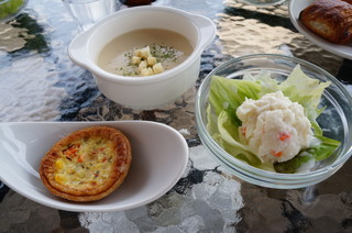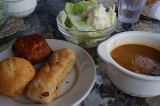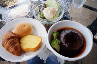 ガーデンミュージアム比叡の園内にあるレストラン「カフェ・ド・パリ」にて昼食にしました。 ・チキンカレーセット ・ハンバーグセット ・ルノワールのカブのスープセット いずれも、パン、ライス、サラダのビュッフェ付き 1600円也。 |