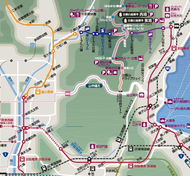 | 大津スタートの坂本~比叡山頂経由~叡山電鉄 一周の小旅行 <場所> 下の地図を参照ください。大津の京阪から坂本経由で比叡山の山頂を越えて京都市に下りるコース。 <こんなところ> 前回、坂本周辺でご紹介をしましたが、そのときに気が付きました。 比叡山頂を山越えして京都の八瀬に降りると、なんと一周できることを・・・。 今回のコース 大津(京阪電車)-坂本駅-徒歩で坂本ケーブル-延暦寺駅-徒歩で東塔バス停-比叡山頂下車 -ガーデンミュージアム比叡を散策-園内で昼食-叡山ロープウェイ-叡山ケーブル-徒歩で叡山電鉄八瀬へ -出町柳駅-京阪三条駅で乗り換え-地下鉄東西線で山科駅-ここからJRで大津へ・・・。 新緑の季節に、本当に心地よい風が吹いていました。リフレッシュできた一日でした。 |
