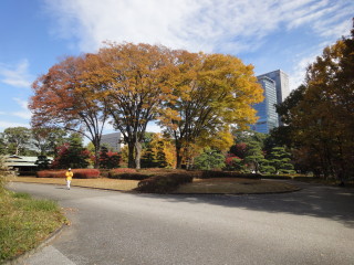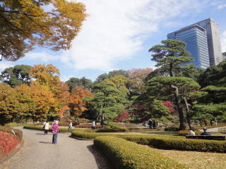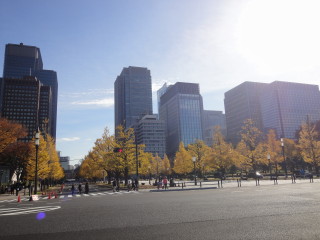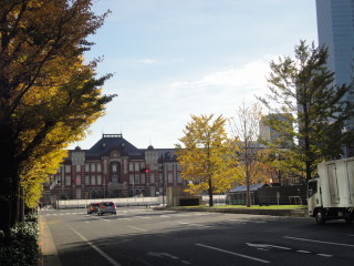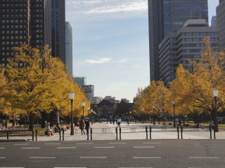 | 東御苑への経路は東京駅経由にしました。 東京オリンピックに向け、この駅前はかなり整備が進んできた感じです。 東京駅から皇居まで、ど真ん中が歩道になっています。(東京駅前はまだ工事中) イチョウ並木で、黄金に輝いてました。 |