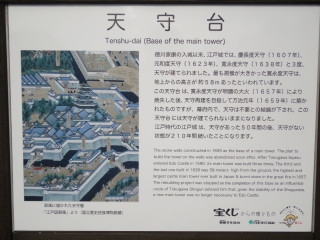 | 天守台が見えます。天守は三度建てられましたが、大火で焼失しています。その天守は58mもあったとされています。 | このような天守だったんでしょうね。天守台は、姫路城の倍の敷地とのことで、その大きさがうかがえます。 |