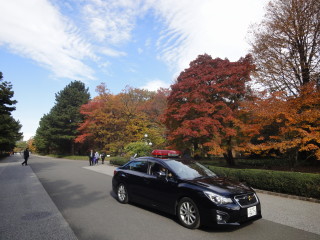 | 光が差す雑木林。グラデーションが綺麗です。 | 御苑内は、こんな感じで、しっかりパトロールされています。無料とはいえ、入門時の持ち物チェックや、御苑内での警備はすごいです。さすがに皇居の隣ですしね。 |