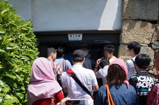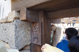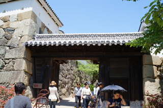 | 入場券を買うのに1時間20分ならび、ようやく入場し菱の門へ。 | ここから天守閣の入場までさらに1時間20分ほどならびました。これは「にの門」、入り口の高さが低くなっています。 |
