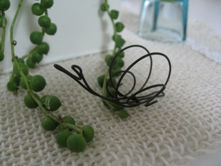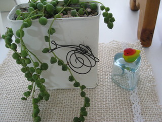 | 今日は雨の土曜日・・・。 じゃなくて豪雨の土曜日。 アメニモマケズ、お出かけしてきましたよ〜 奥田由味子さんの作品展に行ってきたのです。 奥田さんはガーデンデザイナーであり、ワイヤー作家であり、そしてうちの長女と奥田さんの長女さんが 昔同じ音楽教室に通っていたこともある、ママ友でもあります(o^ひ^o) 奥田さんがご主人のお仕事の都合で引っ越されたり、うちが引っ越したりと ここ数年は全然会えないでいましたが、年賀状を頂いたり、作品展の案内を頂いたり 奥田さんのホームページでそのご活躍を知ったりしてずっとつながっていたとてもありがたい存在の方です。 そんな奥田さんが6月末から7/4まで、元町のギャラリー”DELLA・PACE”で作品展を開かれています。 テーマは”it’s beside me.” 植物をいつも身近に飾りたいという奥田さんの願いが込められた展です。 おしゃれな街、神戸・元町への途中、長女同士が音楽教室に通っていた頃のことや、 奥田さんの作ってくれるおいしいシフォンケーキのこと、奥田さんの作るかわいいテディベアに影響されて 私もベア作りをはじめたこと(はじめはおサルさんみたいなベアだったけど)・・・ いろんな懐かしい記憶が甦って来ました。 元町の駅から徒歩3分・・・のはずがちっとばかり迷いまして・・・(笑) 10分近くかかったかな(;゜0゜) でも、素敵なギャラリーの前に立つと、ちょうど中からお客様を見送りに奥田さんが出て来られて 感動の再会でした!! 変わらず優しい笑顔の奥田さんに会えて、嬉しくて嬉しくて周りが全然見えてなかった私は あろうことか壁に飾ってある作品にガツンと激突し、落としてしまったのです・・・ごめんなさい奥田さん(涙) 私も変わらずそそっかしいでしょ・・・。 中に入るとそこは「奥田さんワールド」 wire&plantsの素敵な共演でした。 wireを花器に見立てるっていう発想がすごいですし、どうやったらwireで滑らかな曲線を描けるのか不思議で 「この曲線は何かを当てて形作ってるの?」と聞いたら 「何も。適当に曲げてる。」という答えでした・・・うぅ・・。神業・・・。 wireの花器と植物にちょっとアクセントになってるのが、wireで作ったカエルやカタツムリ。 これがまた可愛くて☆ 写真のグリーンネックレスとカタツムリさんの共演は、ギャラリーにあった作品。 カタツムリさんがどうして缶にくっついていると思います? 缶の内側にマグネットが入っていて、wireのカタツムリさんはくっつくんです。その表情がなんとも言えなくて ひとつ購入させて頂いたんです♪今リビングの出窓において眺めています。 家で学園祭準備をしていた長女も部活から帰ってきた次女も 「かわいい〜〜〜」と感激しておりました。「すごいやろ〜」って私が作ったんちがうのに自慢したりして。 奥田さん、今日は素敵な作品の数々を見せてもらって本当にありがとう♪ 雨なのにギャラリーにお客様は絶えることがなく、じっくりお話することができなかったけれど また改めてゆっくり会いたいなぁ・・・。 これからも素敵な作品作り続けてくださいね。応援しています!! ”DELLA・PACE” http://della-pace.seesaa.net/ ![]() |