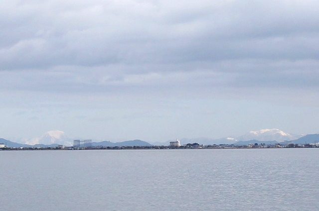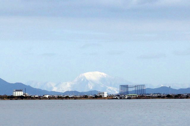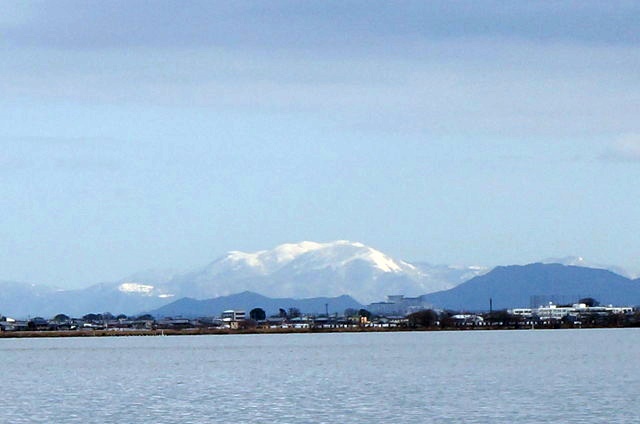 湖岸に出てみると、比良山系にもうっすら雪。そして遠く伊吹山を眺めてみるとこちらも真っ白な巨大な怪物のように見えました。