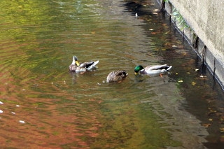 カモたちが浮かんでいるのは湖ではなく小さな川ですが、水面もほんのり赤く色づいて、季節が進んでいるのを感じます♪