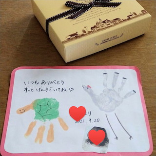 | 明日の「敬老の日」に先立ち、長女一家がプレゼントとお昼ごはんのピザを持ってきてくれました。 プレゼントは、孫の手型を使った鶴と亀。 SNSにこのような手型アートが紹介されているのを長女が見つけて、それを参考に作ってくれたようです。ありがとう。嬉しいです。 鶴は千年、亀は萬年。 こんなおめでたいカードをもらったら、がんばって元気でいないといけませんね! 自分が敬老の日に祝ってもらう年齢になったんだぁとしみじみ思います。 体の変化、心の変化、考え方や食べ物の好みの変化など、若いころには考えもしなかったことが起こって、人間の不思議を身をもって感じています。 人生の先輩方も、おそらく同じような経験をされて、不安に思ったりしながらも、その時々で自分にできること、楽しめることを見つけて過ごしておられるのだろうなと想像します。 そう思うと、「敬老の日」の「敬」の字のとおり、まさに敬いたいという気持ちになります。 私もシニアの1人として、それに習って生きていきたいです。 決して「毎日が絶好調」とは言えないけれど、どんなときも自分で自分のご機嫌を上手に取って、日々を楽しめたらいいなと思います。 一番身近な、お手本になっている人生の先輩はやはり両親です。 「あちこちガタが来てる」と嘆きながらも、体に気をつけながら、野菜を育てるなど楽しみを見つけてなんとか元気でいてくれています。 そんな姿がありがたく、励みになります。 「これからも元気でいてね」・・・そんな気持ちを込めて、ふたりの好物のひとつ、コーヒー豆を贈りました。おいしいコーヒーを淹れて、味わってくれたら嬉しいなと思います。 ![]() (2021.09.19miyu) |