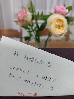 | 昨晩は長女一家と次女夫婦がうちに集まって、結婚記念・入籍記念のお祝いをしました。 私たち夫婦と長女夫婦は今月に結婚記念日を迎えます。また、次女夫婦は来月に入籍記念日を迎えます。 みんなで焼き肉を囲んで「おめでとう」と言い合いました。 長女が買って来てくれたケーキや次女が用意してくれたフルーツも頂いて、ず~っとおいしい時間が続きました。 「結婚記念日おめでとう」とプレゼントも渡してくれて、ポッと温かい気持ちになりました。 お腹がいっぱいになり満足した孫は、まるでアスレチックのようにお父さん(長女のだんなさん)の肩によじ登って遊び始めました。 その様子を見て、ふと娘たちの小さい頃を思い出しました。 同じことをして遊んでいたなぁ・・・と。 そんな娘たちも大人になり、それぞれの道を歩んでいます。 長女は先月引っ越しをして新たな場所での3人の生活を楽しんでいますし、次女はお休みの日のはだんなさんと2人で好きなアーティストのライブに出かけたり美術館に出かけたり有意義な時間を過ごしているようです。 これからもその幸せを大切に、ますます実り多き人生にしていってくれることを願ってやみません。 結婚記念日、入籍記念日おめでとう♪ ![]() ![]() (2024.06.03 miyu) |