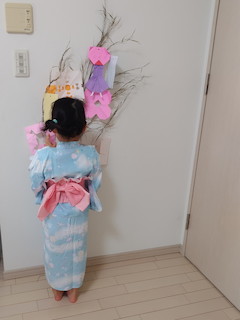 | りーが生まれて3週間が経ちます。 長女とりーが退院した後は、自宅へ戻り4人家族がスタートしました。 産後の体を労ってもらうため、しばらくは私が長女宅へ通い、食事の支度や沐浴のお手伝いをすることにしました。ところがちょっと訳があって、長女、るー、りーの3人が我が家で過ごすことになりました。 1週間余りの期間、朝から晩までお正月とお盆が一緒に来たような忙しさと賑やかさの中過ごしました。 それでも、りーの寝顔に癒され、るーにはよく笑わせてもらっていました。 私がりーのためにと作った肌着を見て「これめっちゃかわいい!私も着たい!」とカーディガンのように羽織ったり……私の結婚指輪を見て「え?ばあばって結婚してたん?」と真剣に驚いたり……「サンタさんが来る頃までばあばのおうちにいたい」なんて言ってくれたり……好奇心旺盛で奇想天外、それでいて大人の喜ばせ方を知り尽くしているような…本当に楽しい子だなぁと改めて思いました。 先日長女、るー、りーは自宅へ戻り、また私が通う日々が再開です。 長女は産後の経過も順調ですが、もうしばらくの間助けてあげられたらなと思っています。 暑い毎日ですが、頑張ります。さて、写真は先日の七夕の日。 るーは浴衣を着て笹に短冊や折り紙で作った切り紙を飾っていました。 短冊には家族それぞれ願い事をしたためて。みんなの願いが叶うといいね! ![]() (2024.07.13 miyu) |