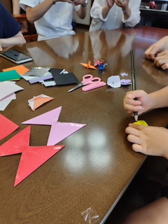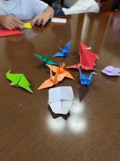 折り紙で鶴を折っていたとき、中には折り方を忘れている大人も(笑)。わかる人が教えたりして、たくさんの鶴を折ることができました。子供と遊ぶことはいい頭の体操になるようです。