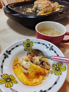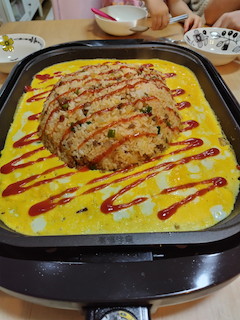 写真は長女のだんなさん特製ビッグオムライス。これを2回作ってくれたのですごいボリュームです。