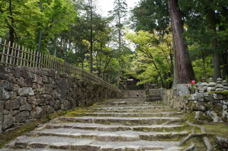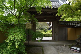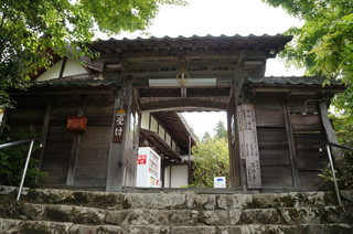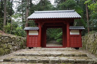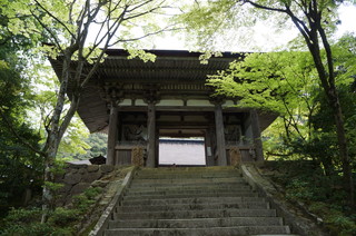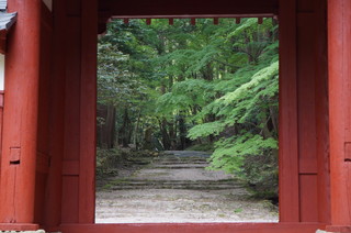 | 1650年に建立された赤門。本来ここから参道を通るのですが、今回は、本坊の近くの駐車場まで行ってしまいました。 | この赤門から見える青紅葉が良い雰囲気です。秋にはもう一度訪れたいお寺です。 |