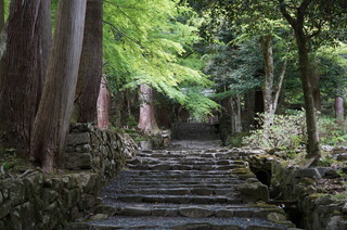 | 遠望台からの眺め、この日はあいにくの曇り空ですが、ここから比叡山が正面に見れるようです。 | この参道がすばらしい。すごく良い雰囲気で当時を偲ばせるような参道です。かなり気に入りました。 |