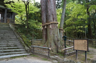 こちらが参道から見た、二天門。 その手前には樹齢1000年の夫婦杉があります。 |