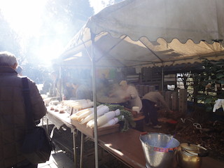<場所> 西国十二番目札所 真言宗醍醐派 岩間山正法寺(岩間寺) 〈いわまさんしょうほうじ(いわまでら)〉 滋賀県大津市石山内畑町82 TEL 077-534-2412 <こんなところ> http://www.iwama-dera.or.jp/ (公式ホームページ) 岩間寺で大根炊きがあるし一緒にどう?・・・と両親が誘ってくれました。 大根炊き・・・?なんか聞いたことあるけどどんなん?気になる!! ホームページにアクセスしてみると、「無病息災大根炊き」と書いてあるではないですか! これは是非出かけて、ありがたい大根を頂かなければ・・・。 毎年12/17に行われている大根炊きは、それはそれは立派な大根をものすご〜い分厚く輪切りにし、 大きな大きなお鍋で煮た、見るからに温まる一品でした。 たっぷりお出汁のしみた大根3切れ、油揚げ、しめじ、昆布で、一人前500円。 すごいボリュームでしたが、柔らかくておいしかった〜 岩間山正法寺は、雷除け観音と呼ばれ、その他諸々の災難除けにもご利益があるそうです。 そして、両親が注目したのは「ぼけ封じ」のご利益もあるということ。 観音様の前には、近畿にある10のぼけ封じのお寺から砂を集めてきた台があり、そこを踏むことで ご利益を受けられるということでした。私もその台に乗らせていただきました、ハイ。 そして鐘も「ゴ〜ン」とついて、これからの健康もお願いしてきました。 岩間山正法寺は、文字通り山にあるので、かなり寒かったのですが、あつあつの大根でとても 温まりました。ごちそうさまでした。 (2010.12.18 現在) |