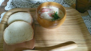 添えられている自家製パンは、もっちり、しっとりした生地で、小麦の味がしっかりしていて、クラムチャウダーに浸していただくと最高でした。
