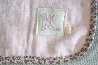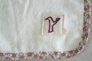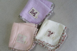 それぞれのイニシャルを刺しゅうし、ラベンダー、ピンク、ホワイトのタオルにつけました。