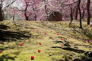 | 紅白の梅が美しいです。 | この神苑には椿も見頃を迎えつつありますが、早くも花を散らしていました。落椿これが緑の苔に散らばり、なんとも幻想的な図柄になっていました。 |