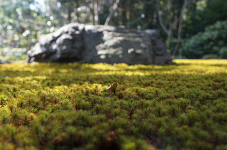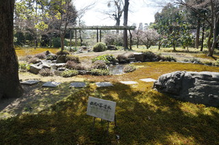 | こちらが曲水の宴が催される庭になります。この遣水の辺で詩が詠まれます。 | こちらの苔がなんとも美しい。 |