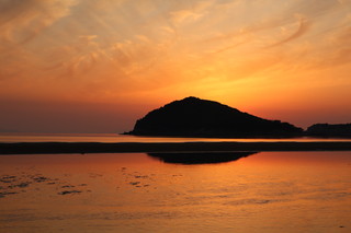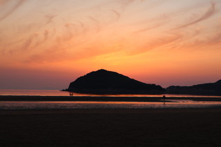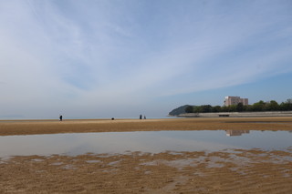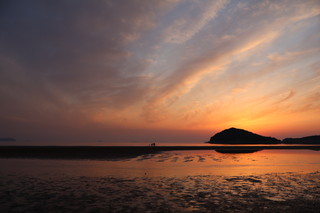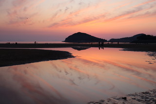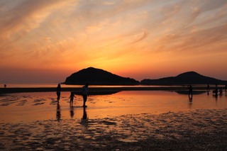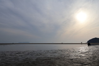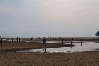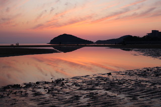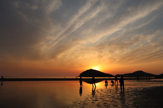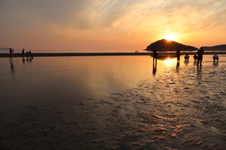 こちらの父母ヶ浜は、遠浅であり干満差が大きく引き潮時には、所々で海水の水たまりが残り、まるでウユニ塩湖のようにリフレクションが楽しめます。夕日が映るリフレクションは本当に美しいです。多くの家族連れが思い思いのポーズで楽しんでいました。 |
