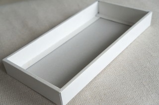 布がきれいに貼れるように、また、布の下から透けて箱の汚れが見えないようにコピー用紙を箱に貼って下準備。