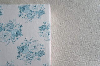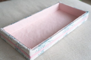 その上から布を貼り付けます、外側は淡い花柄、内側はピンクのピンドット。