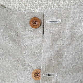 後ろで留めるボタンは、刺しゅうの花とリンクさせて木目調のナチュラルなものに。