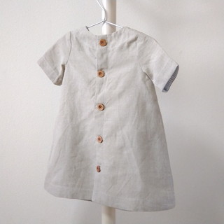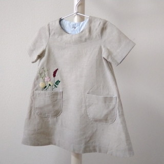 リネンの布で作ったシンプルなAラインのワンピースに、花々の刺しゅうがアクセント。