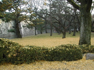| 本丸があった内堀。 | 二条城園内は、都会の真ん中にあるとは思えないほど、静かで、自然にあふれた場所です。ちょうど銀杏の葉が落ち、まるで黄色いジュータンのようでした。 |