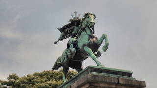 | 楠正成像。南北朝時代、南朝の後醍醐天皇についた武士で、鎌倉幕府を転覆させた人物です。尊王派として、皇居を向いています。 | これは、桜田門から、都心を臨む、広大な敷地と緑、そして、ビル群。首都、東京にふさわしい場所です。 |