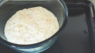 表面に強力粉を振って鍋の蓋をする。30分〜1時間、鍋の中で生地が1.5倍くらいになるまで発酵させる。