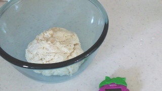 手に打ち粉をして、生地をボウルから取り出し、両手で引っ張ってのばし、裏側でしっかり閉じる。5〜6回繰り返して表面をなめらかにする。