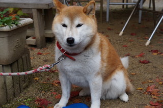 | こちらは「ウメちゃん」看板犬とのことです。かわいい! | 参道は、本当に真っ赤で、また、黄色い紅葉もあり、このグラデーションがきれいです。 |