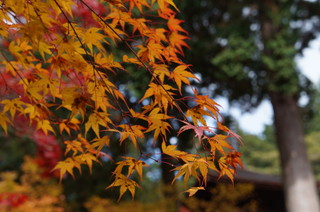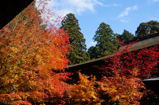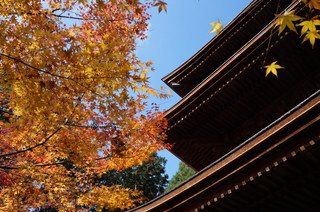 | 境内は、紅葉一色です。赤に黄色にと、青空も映えて、とてもきれいでした。 | こちらが重要文化財の三重塔。紅葉に囲まれた、このショットがいいですね! |