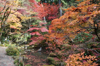 | 日本庭園の園内も紅葉がちょうど見頃でした。 | 池に真っ赤な紅葉が映し出され、とても幻想的な風景です。 |