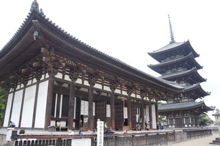 | 国宝の東金堂と五重塔。東金堂には、726年に聖武天皇が叔母元正太上天皇の病気全快を祝い建立。その後、6度の焼失があり、現在の建物は、1415年のものです。堂内には、本尊薬師如来像など重要文化財と、文殊菩薩など国宝が安置されています。 | 国宝の五重塔は、730年に創建者の藤原不比等の娘光明皇后が建立。その後、5度の焼失があり、現在の建物は、1426年に再建されました。 |