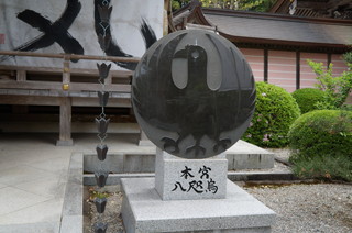 八咫烏とは、主祭神である家津美御子大神(素盞鳴尊)のお仕えです。日本を統一した神武天皇を、大和の橿原まで先導したという神武東征の故事に習い、導きの神として篤い信仰がある。八咫烏の「八咫」とは大きく広いという意味です。八咫烏は太陽の化身で三本の足があり、この三本の足はそれぞれ天・地・人をあらわす、といわれています。 |
