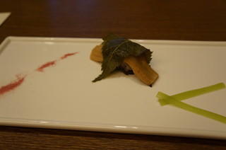 アナゴの桜寿司。字の通りですが、穴子に桜の葉が巻かれています、こうしたアレンジのお寿司は初めてです。 |