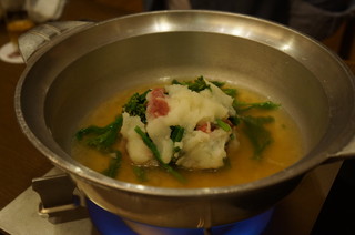 熊野地鶏と菜の花のみぞれ鍋。これはおいしいl。みんなにも大評判でした。 |