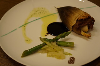 | 鯛が筍の皮で包まれ焼いてあります。 |