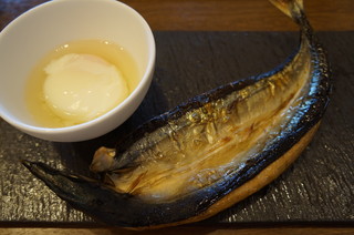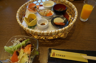| 朝食は、おばんざいセットに、焼き魚は干物のさんま。これが大変おいしかった。 |