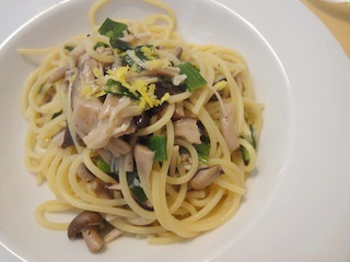 | メインのパスタ。私はきのこのオイルソースにしました。たっぷりきのこに黒こしょうがピリっと利いて大人の味でした。 |