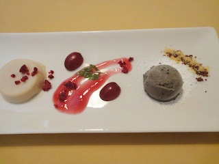 | デザートの黒ゴマアイスと紅茶のブランマンジェ。黒ゴマの味が濃厚でおいしかったのですが、紅茶の味がわかりにくかったので、先に紅茶のブランマンジェをいただくべきでした。でも舌触りがツルンとしていておいしかったです。 |