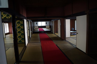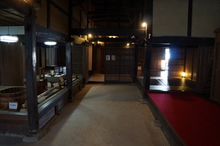 | 玄関広間から続く畳廊下。この奥には、大名など主客に使用さえた上段の間があります。 | 土間台所。ここには直接馬も引き入れたとか。 |