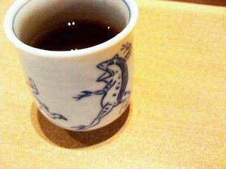 | 運ばれてくる少し前から「お茶の匂いがする」とわかるくらい香りのいい京番茶。「鳥獣戯画」の一部が描かれているお湯のみも京都っぽいです。 |