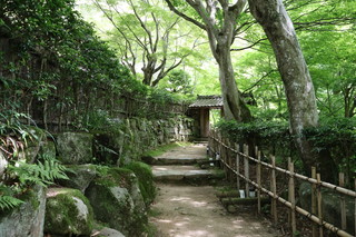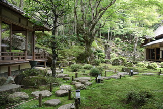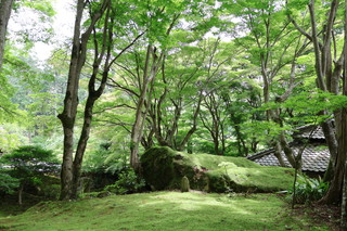 境内は苔に覆われ青紅葉との新緑の世界が創り出されています。 |