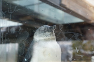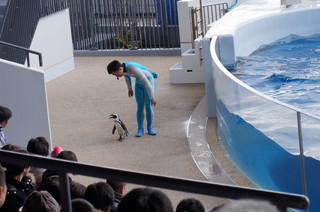 | この日は雪の舞う日で寒空でしたが、イルカショーは楽しいですね。イルカの鳴き声と、観客の笛とのコラボなど楽しい企画もありました。 | 途中にペンギン君も登場しました。 |