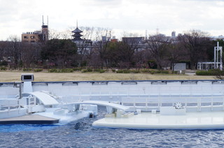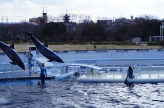 | ライトとくらげで、まるで雪が舞っているようでした。 | こちらはイルカショーのプール。奥には東寺の五重塔が見えます。なにか不思議な風景です。 |