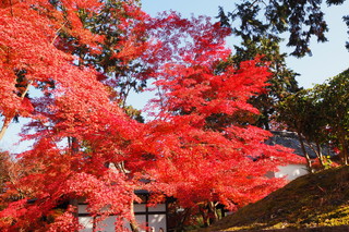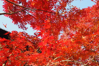 朝の陽射しに照らされた紅葉は、赤色に輝いていました。