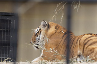 こちらは、もうじゅうワールド。 ライオンやツシマヤマネコ、ジャガーがいるのですが、みんなお疲れ気味なのかごろんと寝ている子たちが多く、こちらのトラだけが唯一起きていました。 |
