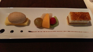 デザートは、右から「サンマルク」というアーモンドのケーキ、季節のフルーツ、マロンアイスとチーズケーキという豪華さ!
